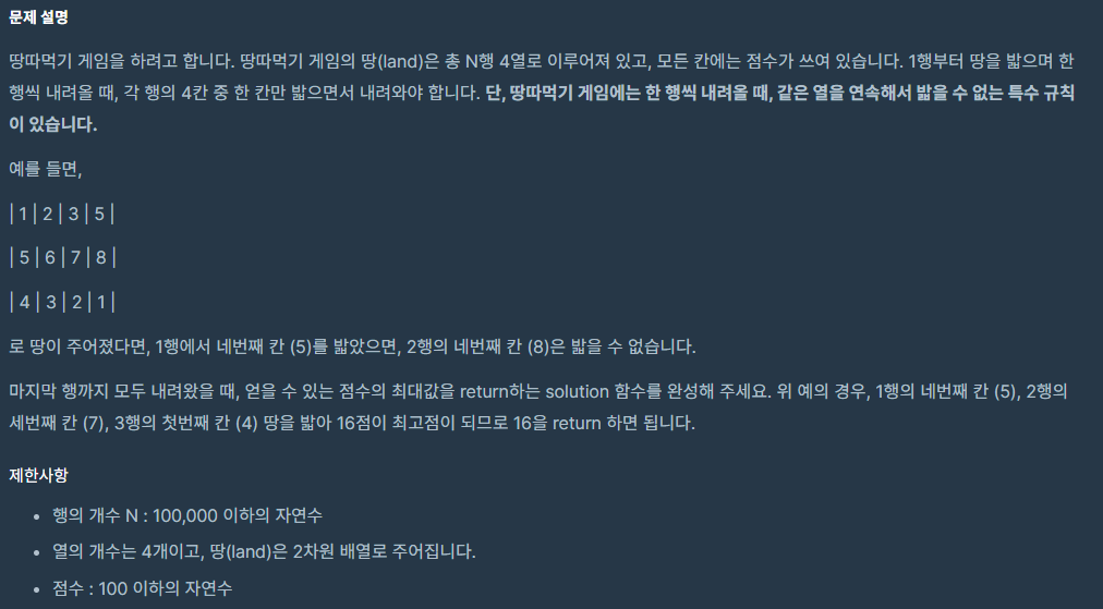아래로 내려가면서 점수를 가장 많이 얻을 수 있는 경우를 찾는 것이다. 하지만 같은 열을 반복해서 밟을 수는 없다.